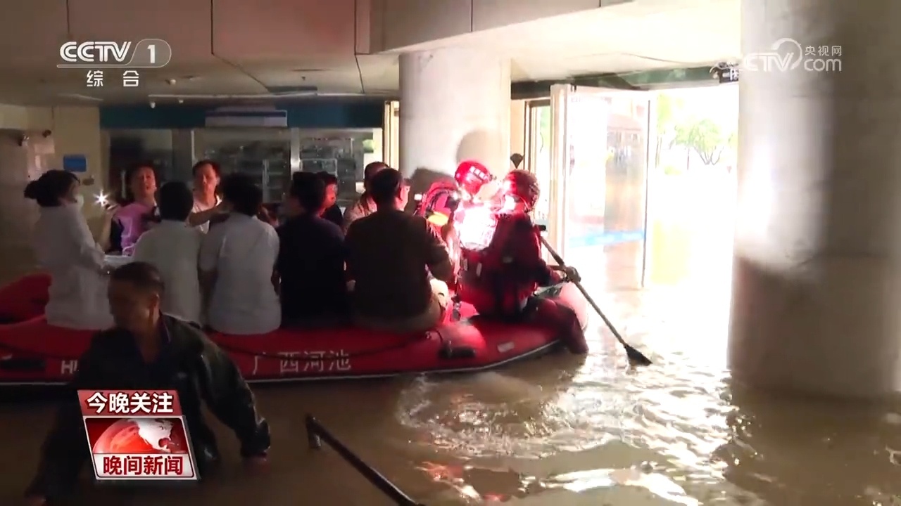 这两天,广西河池多地遭遇强降雨天气。河池市人民医院住院部大楼一层出现严重积水,几百名住院的病人和陪护家属需要转移,救援人员迅速行动起来。