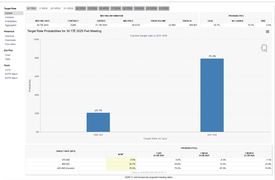 美联储下一次会议定于7月29日至30日举行。芝商所的美联储利率观察工具显示,美联储7月维持利率不变的概率为79.3%,降息的概率为20.7%,而一周前降息概率仅为略高于10%。