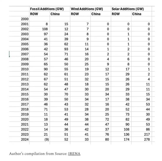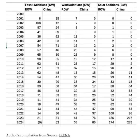 图表展示了中国与世界其他地区在化石能源、风能和太阳能方面的年度净新增装机容量(以吉瓦计)。来自IRENA的数据显示,中国在风电和光伏领域的增长速度已远远领先于其他国家。