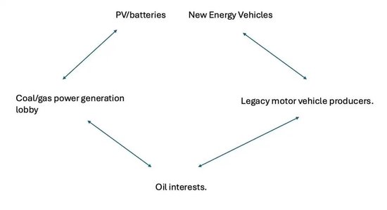 如果试图描绘这一力量场的格局,显而易见的是,中国绿色能源革命强烈冲击了西方的两个主要利益群体。这一点,值得一再强调。