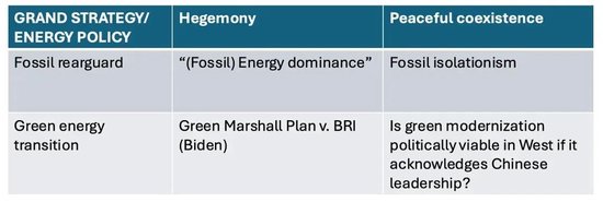 另一方面,也可以考虑美国未来可能采取的一种“化石能源孤立主义”策略。如今越来越难以否认,美国或许正朝着这样的方向努力——让中国承担绿色能源转型的重任,而美国则继续维持其化石能源世界。这种策略可能是一种和平共处的方式,但气候问题显然会持续承压,而且这并不意味着美国会在国际事务中承担积极责任。